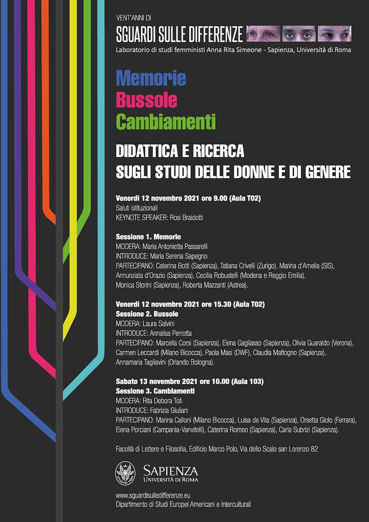 Per il laboratorio, bussole sono state il confronto intergenerazionale, un certo modo di intendere gli studi di genere (SDG) all’interno dell’Università, un modello di produzione dei saperi condiviso e cooperativo, l’esplorazione di temi di dibattito sui quali far convergere i nostri diversi sguardi: il desiderio, il potere, il corpo, la costruzione degli stereotipi di genere hanno rappresentato le nostre bussole e ci hanno permesso di individuare i punti cardinali su cui fondare la nostra ricerca all’interno degli studi di genere.