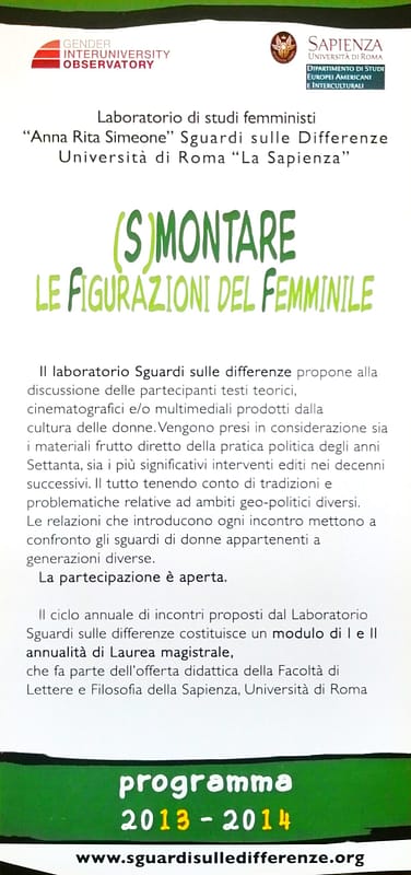 22 novembre 2013, ore 16.00 Rileggiamo un classico del pensiero femminista Discussione di Betty Friedan, La mistica della femminilità, Castelvecchi 2012Modera Mariagabriella Di GiacomoIntervengono: Serena Sapegno, Federica Giardini, Sara De Simone 18 gennaio 2014, ore 9.30 La vittima Discussione di una selezione di saggi sul femminicidio e sulla costruzione della vittimaModera Serena SapegnoIntervengono: Manuela Fraire, […]